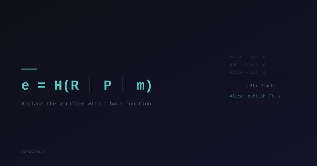 Schnorr signatures started as a back-and-forth conversation. Fiat-Shamir turned that conversation into a one-liner. Here's how a hash function replaces a trusted stranger.